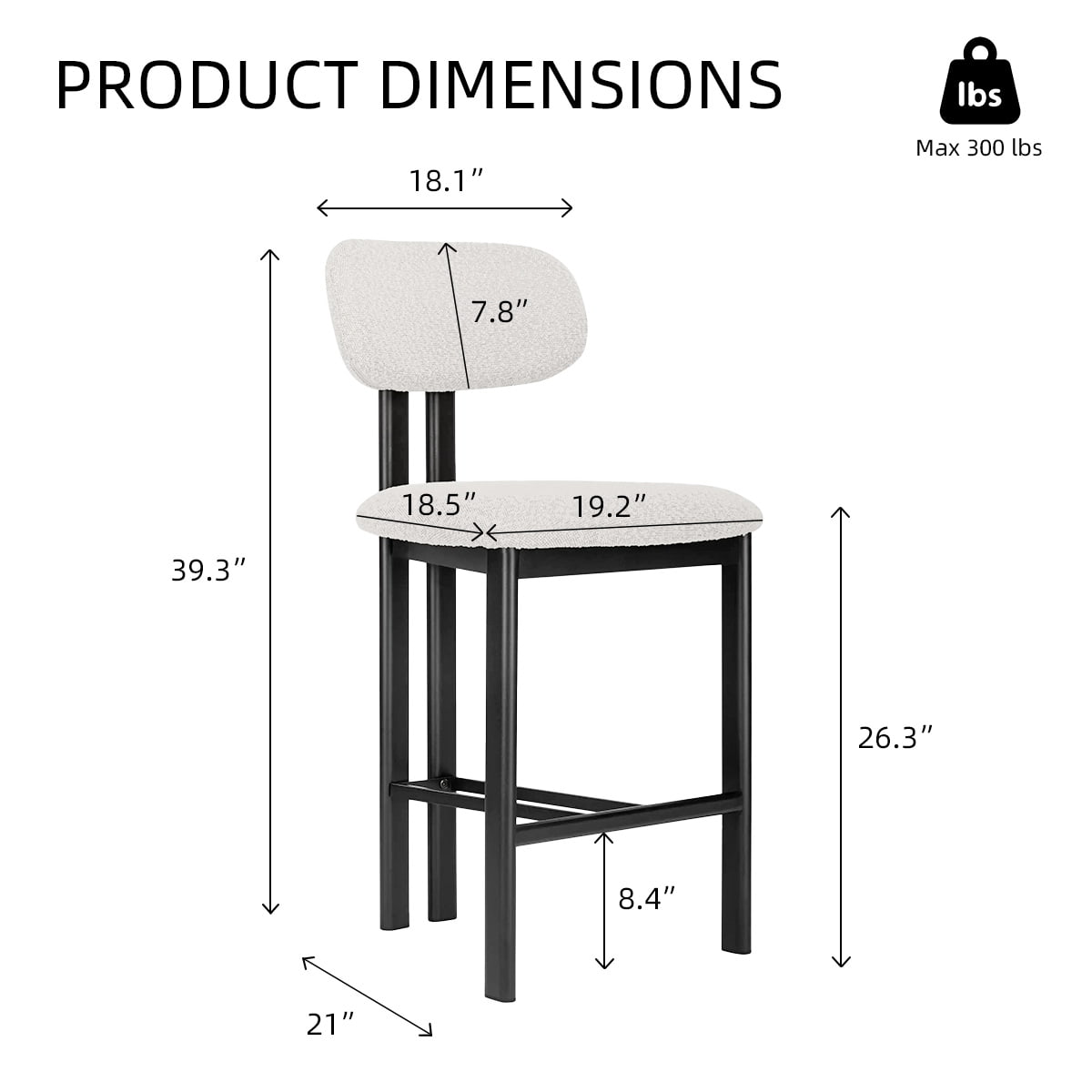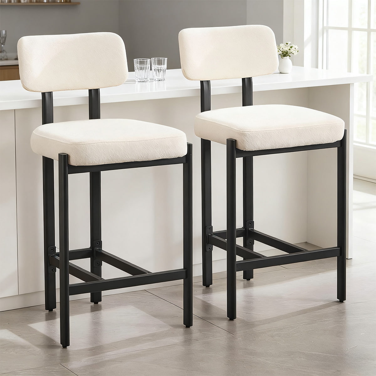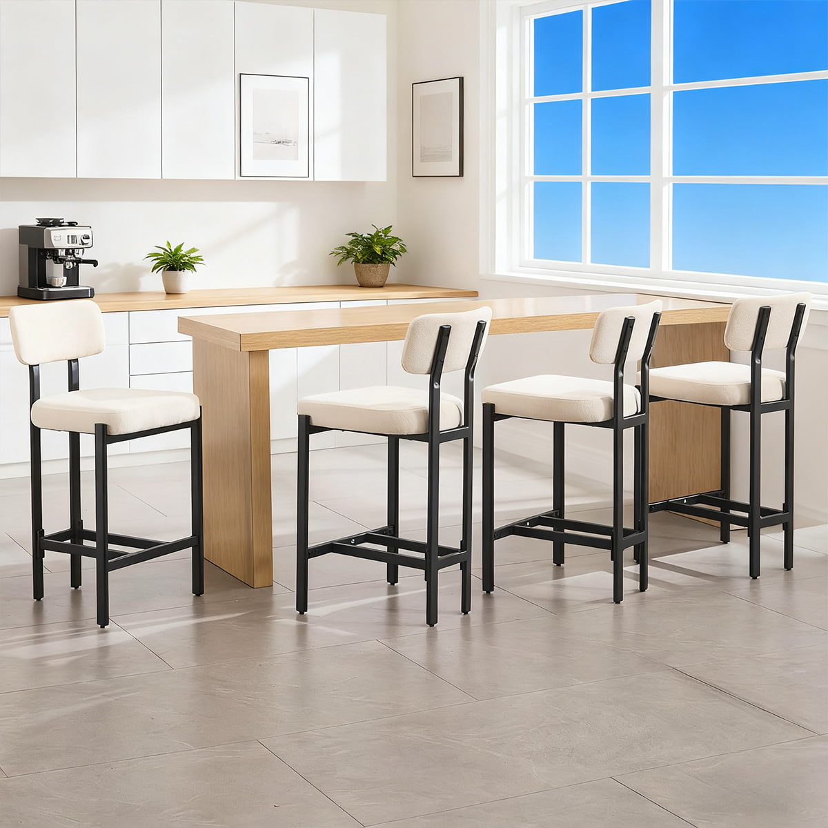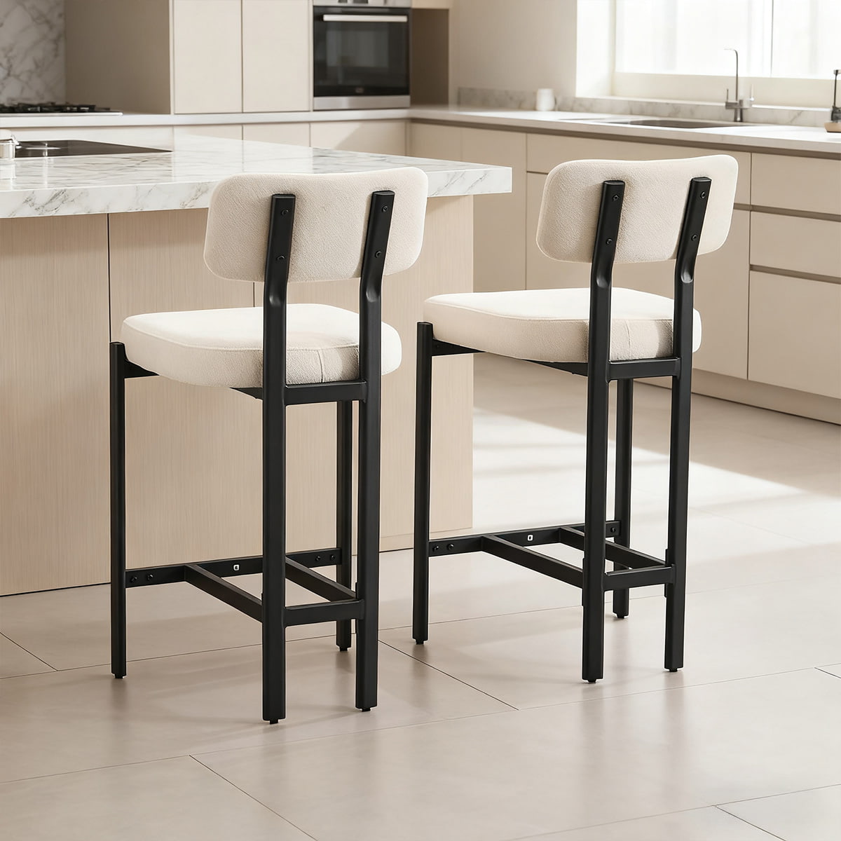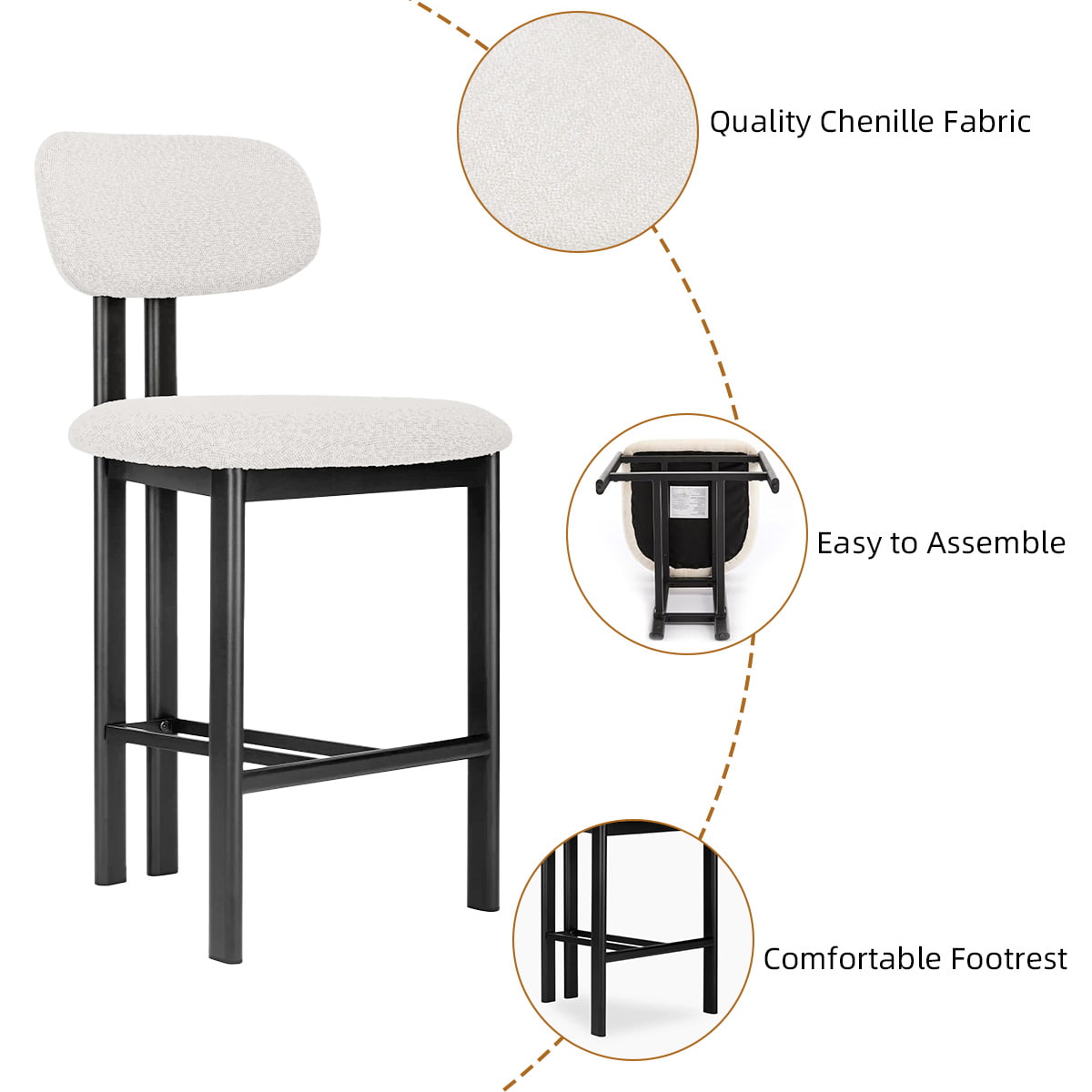 Moderne BeigeChenille Barstoler i benkehøyde — Polstrede, buede ryggstoler med metallben og fotstøtte for kjøkkenøy, hjemmebar eller spisestue