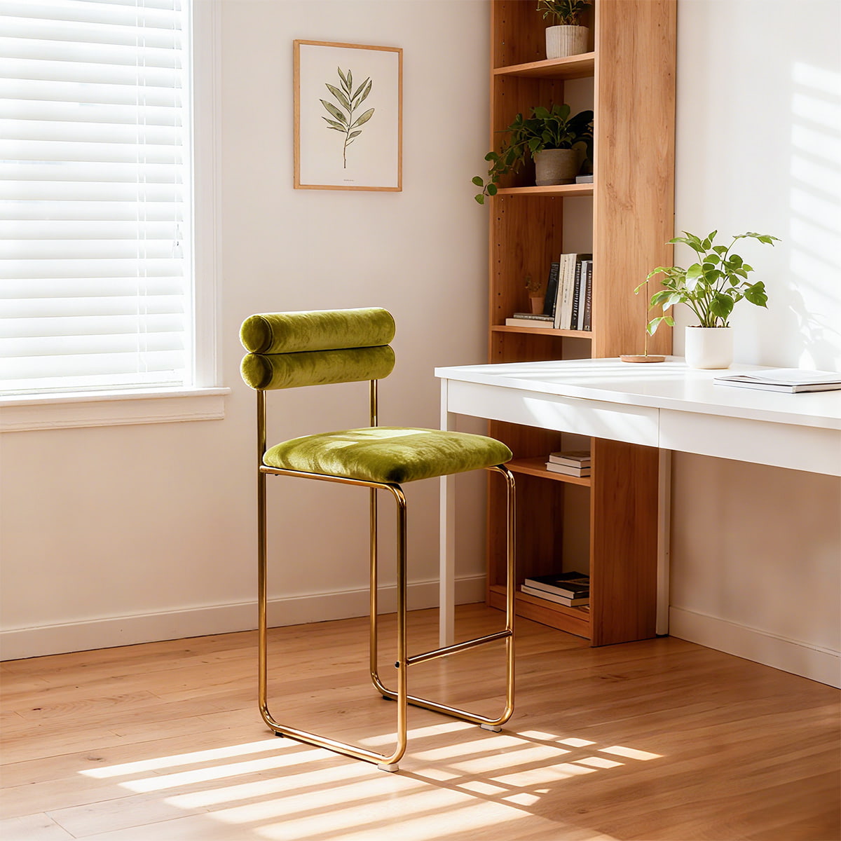 lære merTa med moderne eleganse og komfort inn i rommet ditt med DUOMEI Green Velvet Counter Height barstol. Dette statement-stykket har et mykt fløyelssete og sylindrisk dobbeltlags ryggstøtte støttet av en gyllen stålramme, som blander moderne estetikk med ergonomisk funksjonalitet.