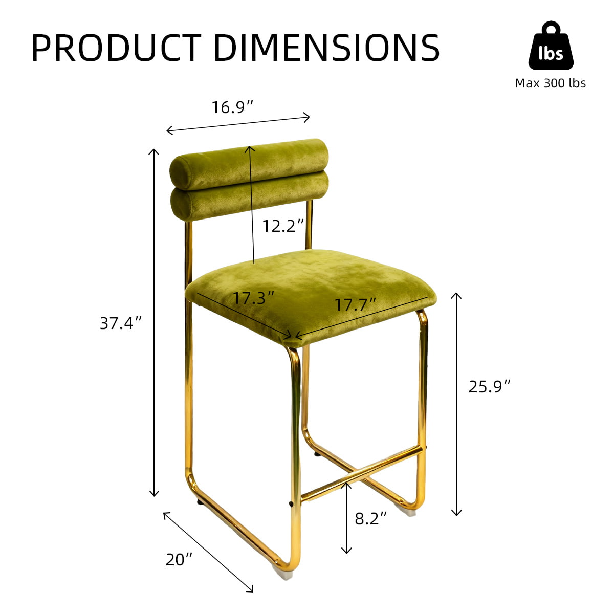 Høyden på 37,4 tommer passer til standard kjøkkenbenker og spisebord, mens setet på 25,9 tommer sørger for optimal komfort for lange samtaler eller uformell middag. Det myke fløyelstrekket gir en luksuriøs taktil opplevelse, og de gullbelagte bena gir et raffinert preg. Med en høyelastisk skumpute og anti-skli base, er denne krakken designet for å kombinere komfort, stil og holdbarhet – perfekt for både hjemme og kommersielle områder.