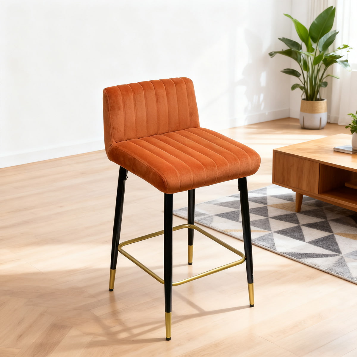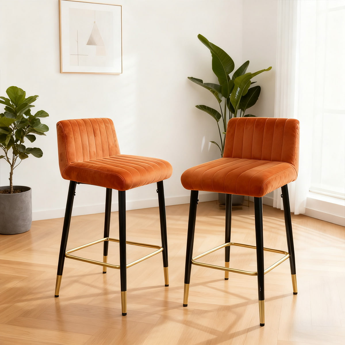 Moderne oker oransje fløyelsbarkrakk — 360° svingbar stol i mothøyde med svarte og gullbein i metall, mykt polstret sete og fotstøtte for kjøkkenøy, bar eller spisestue