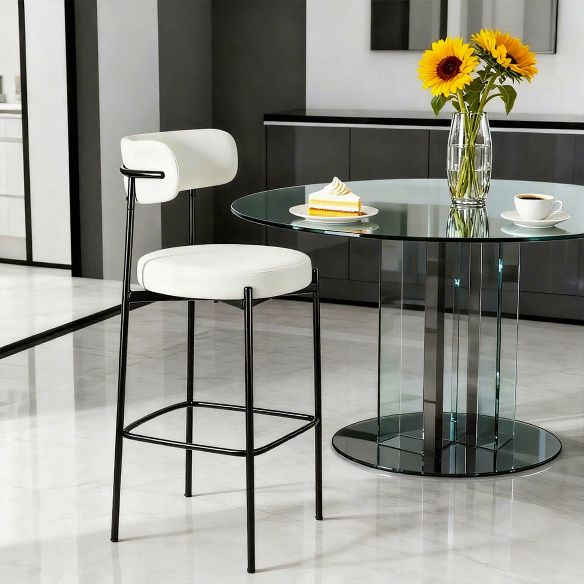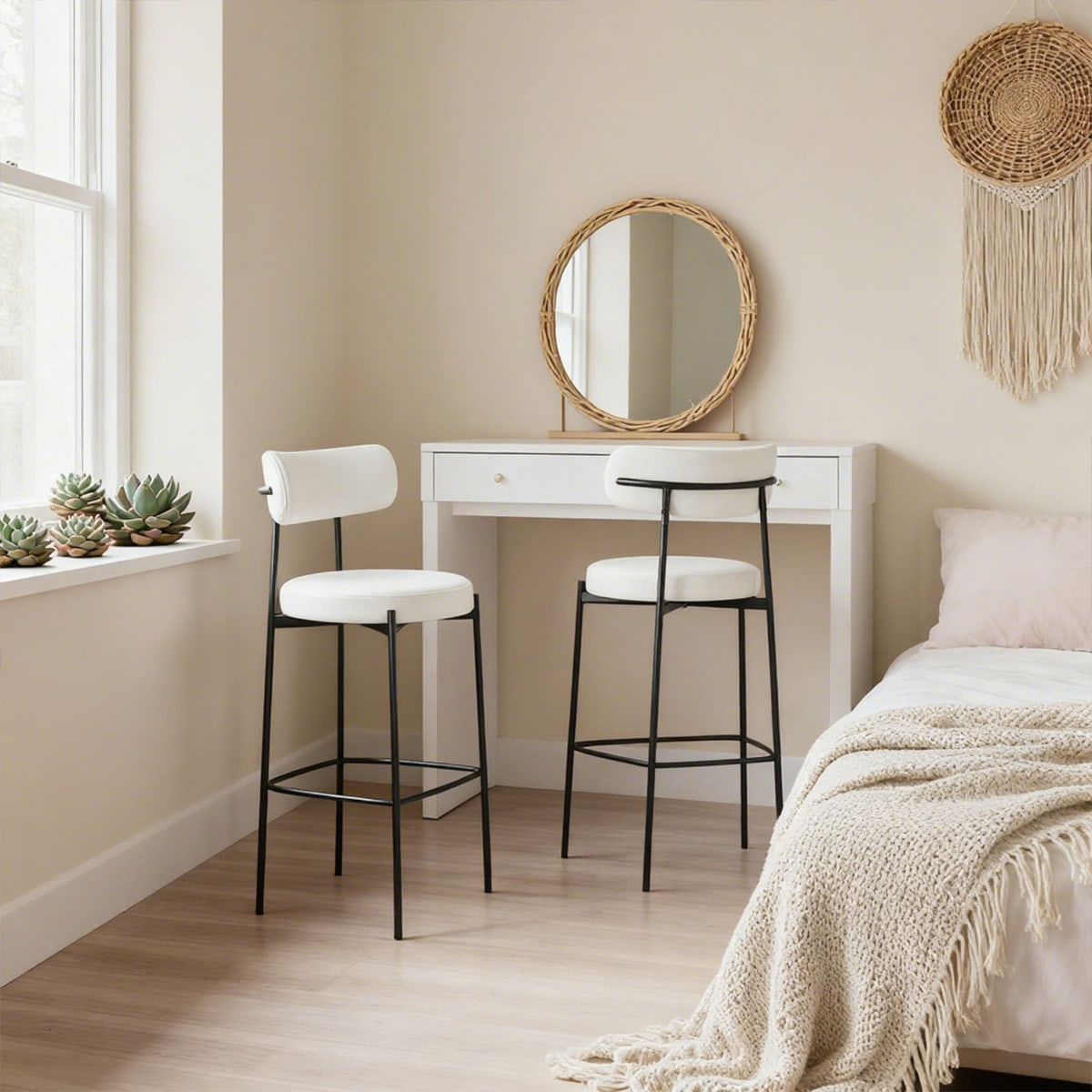 Våre hvite bouclé benkekrakker er konstruert for komfort og stil, med holdbare svarte metallrammer, skumseter med høy tetthet og ergonomiske ryggstøtter – ideelle for kjøkkenbenker, barer, restauranter og hoteller.