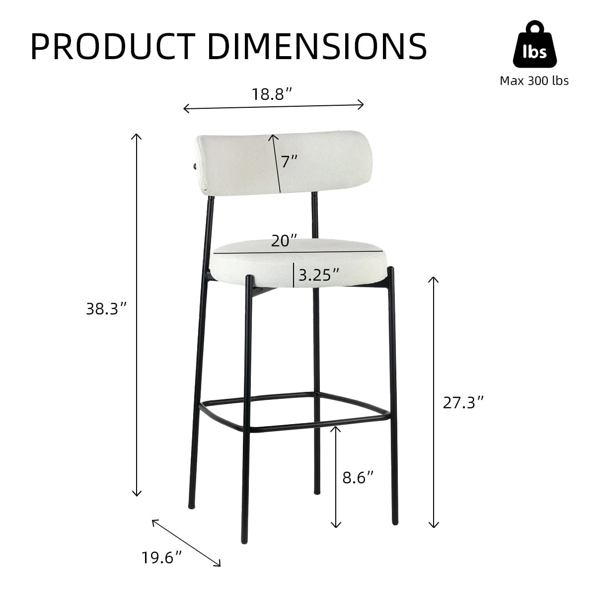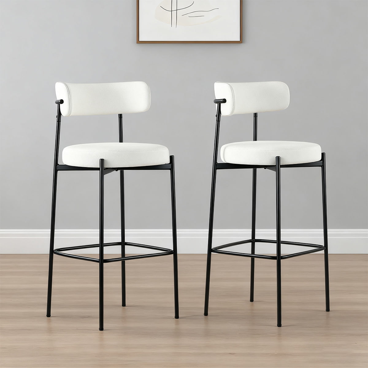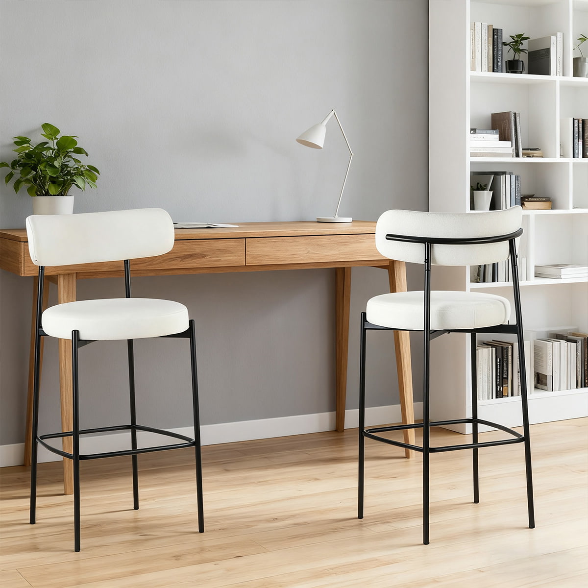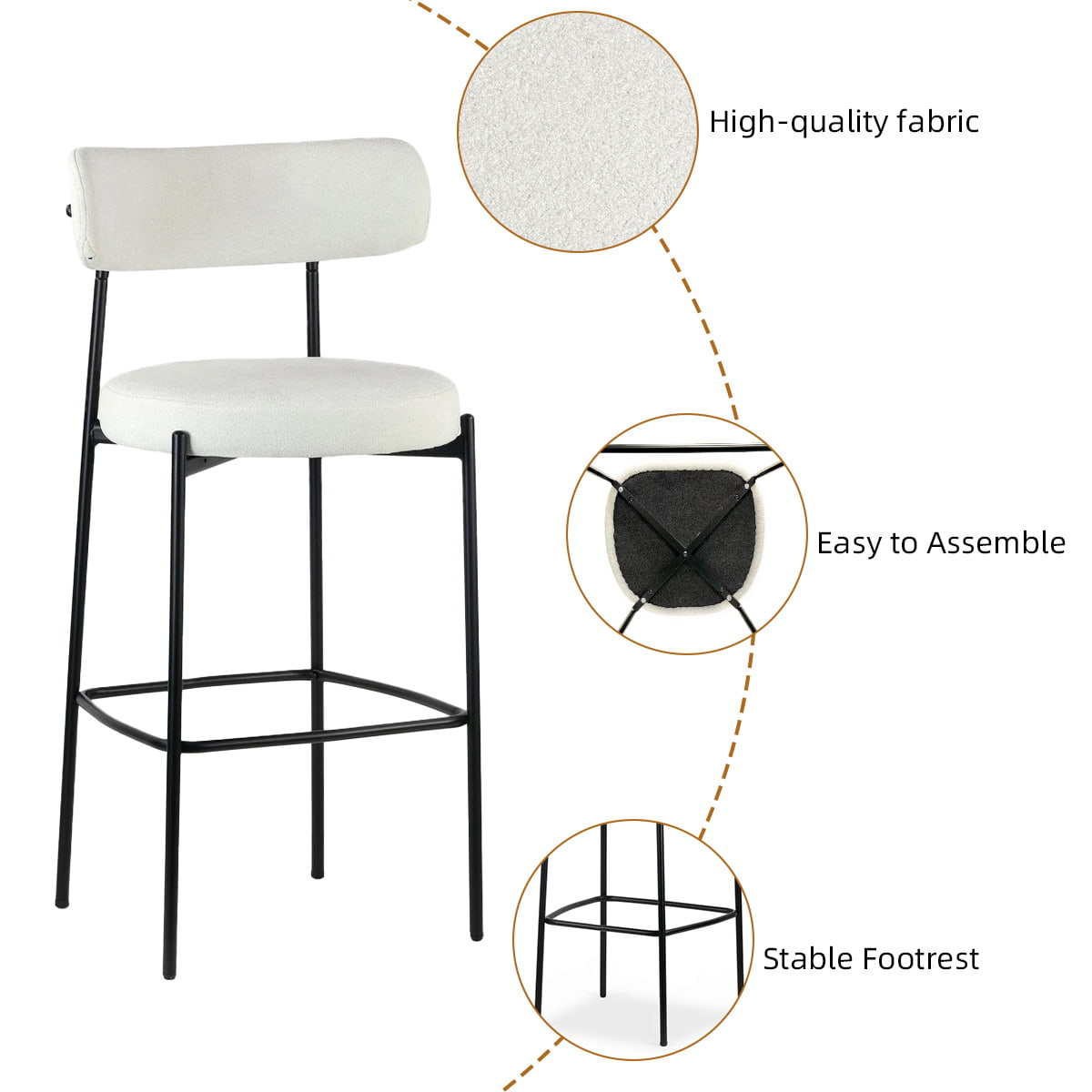 Moderne hvit Bouclé barkrakk med svarte metallben — polstrede barstoler i mothøyde med ryggstøtte og fotstøtte for kjøkkenøy, spisestue og hjemmebar