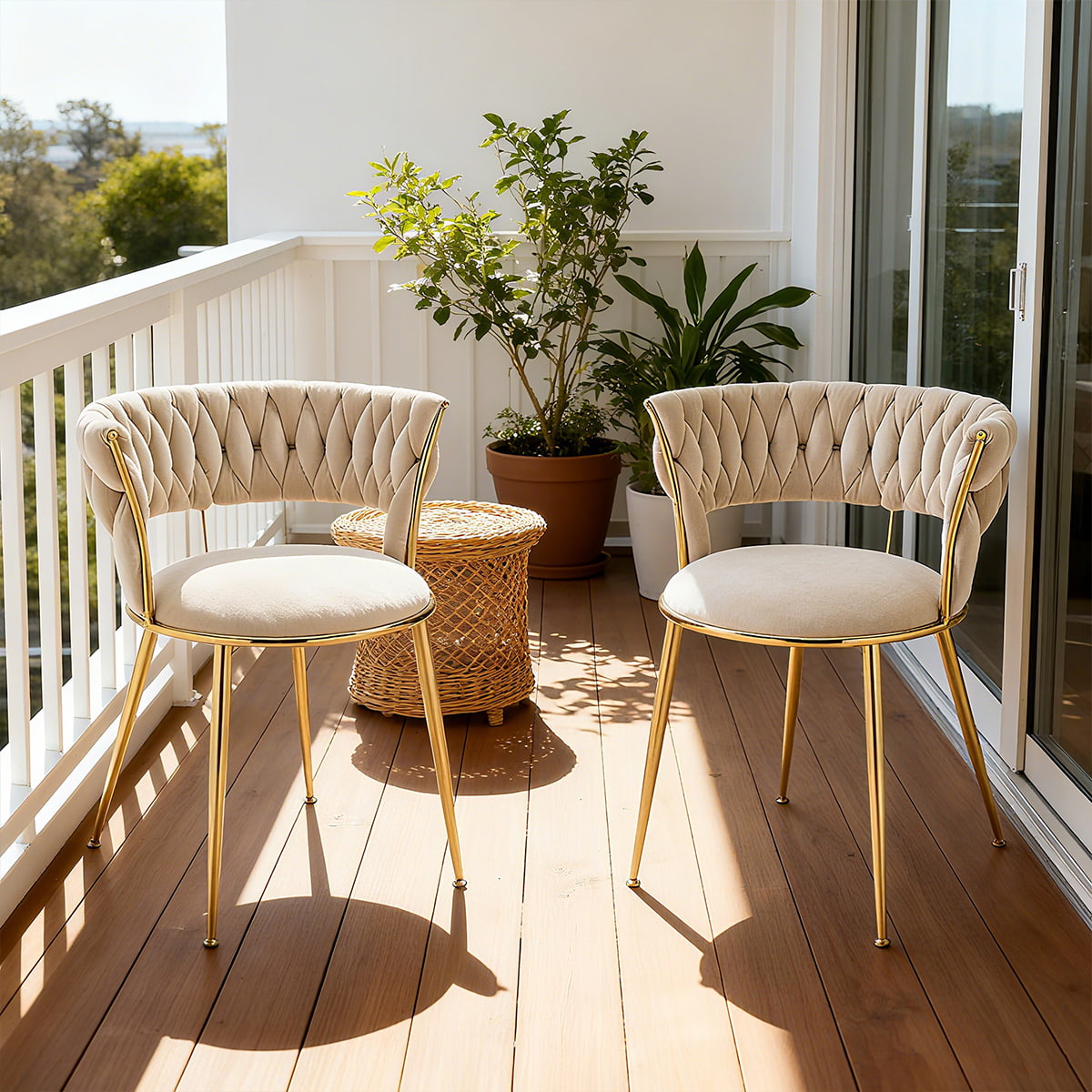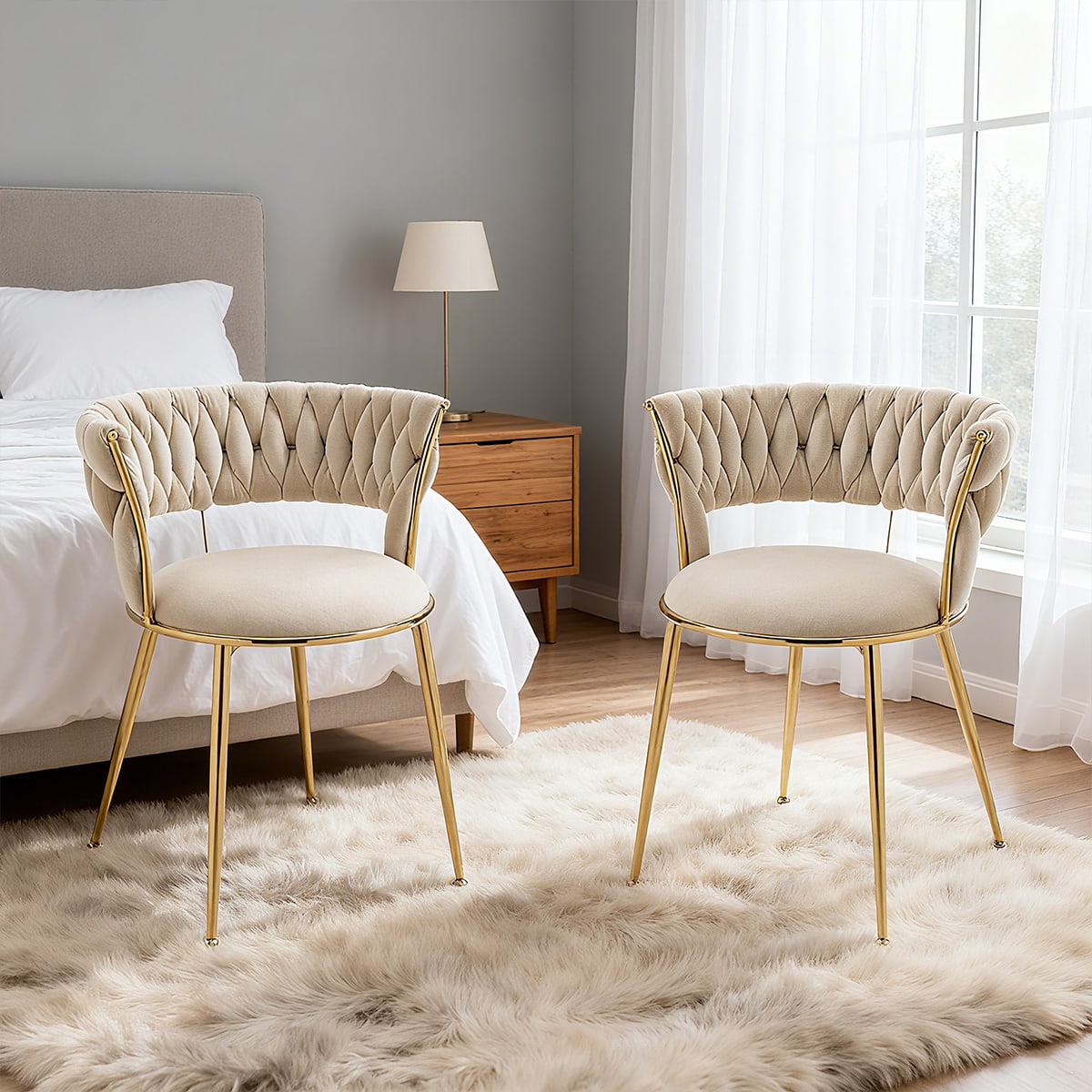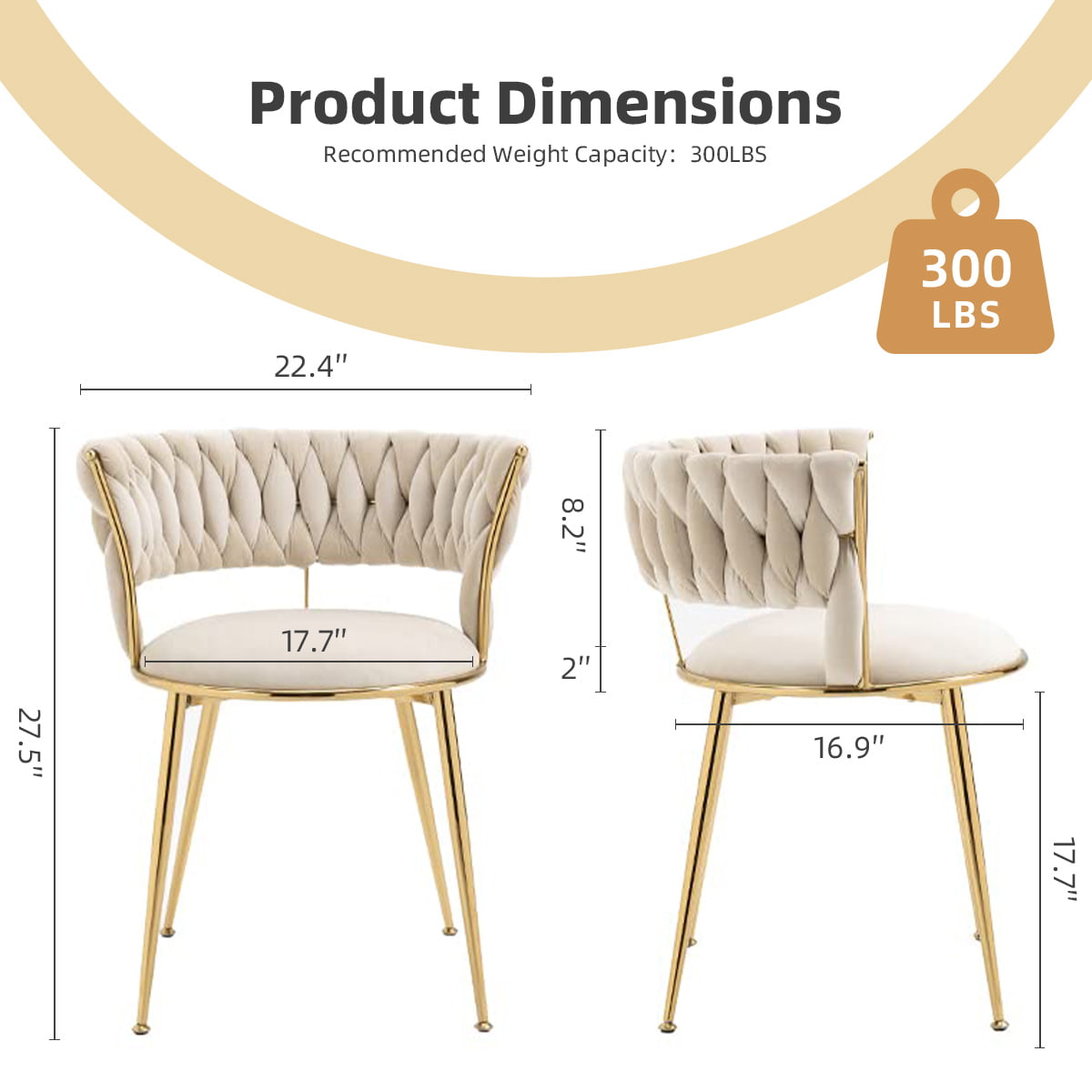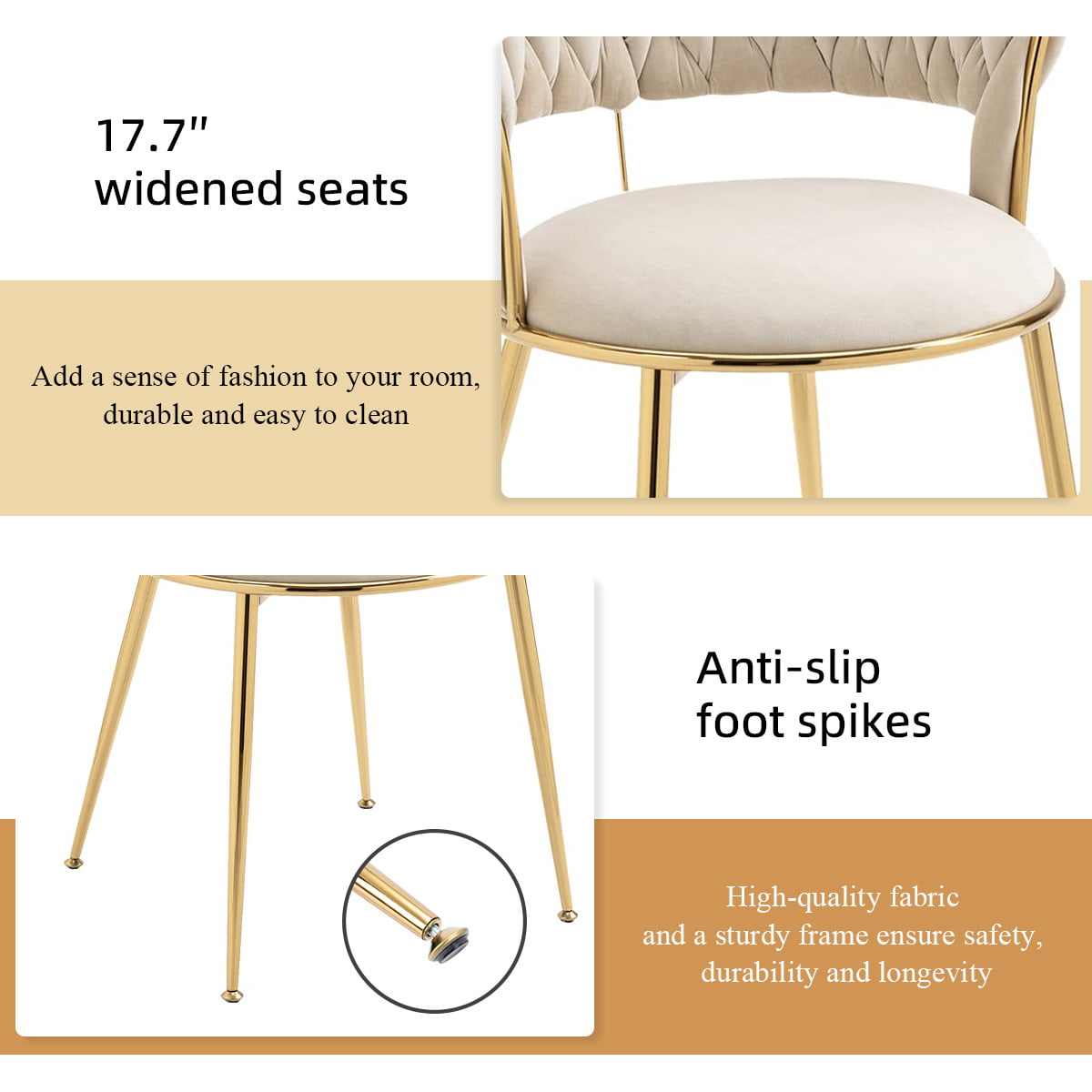 Moderne spisestuestol i fløyel i elfenben med vevd ryggstøtte og gullmetallben – elegant polstret aksentstol for spisestue, kjøkken eller stue