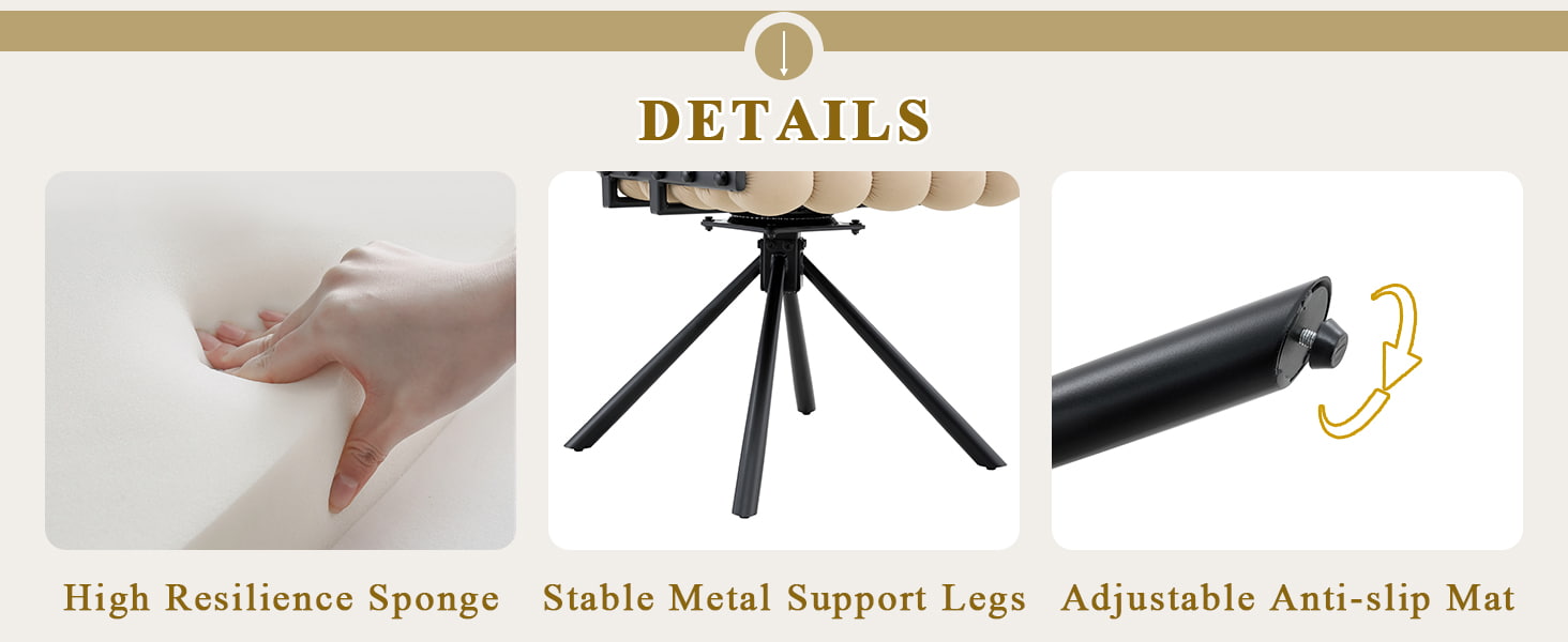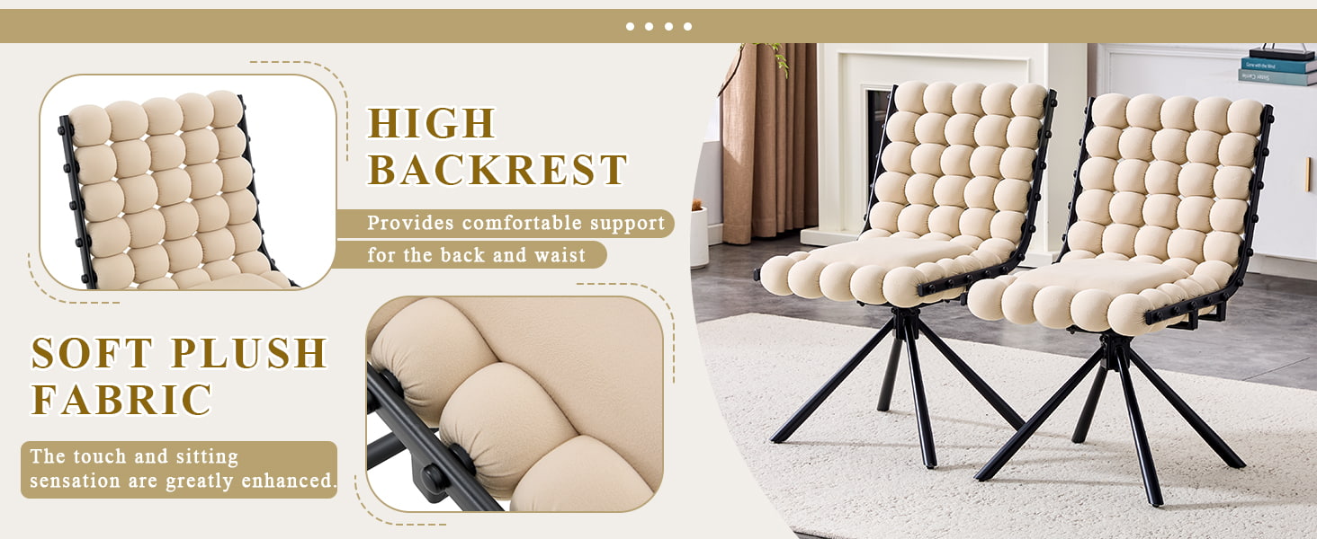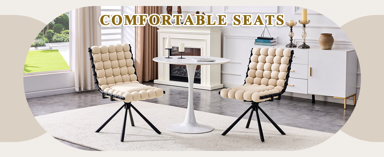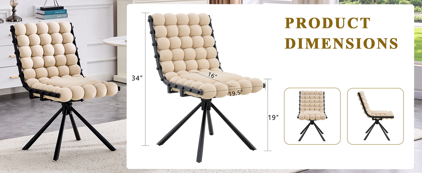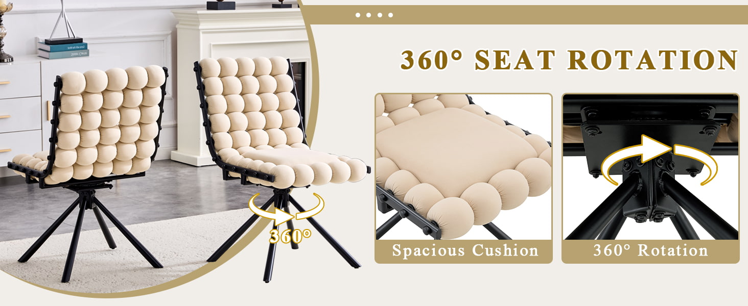 Denne svingbare spisestuestolen i fløyel er designet for moderne spiserom, livsstilsinteriør og kommersielle boutique-miljøer. Stolen har en skulpturell bobleputerygg og glatt nederlandsk fløyelstrekk, og kombinerer iøynefallende design med hverdagskomfort. Den 360-graders svingfunksjonen tillater fleksibel bevegelse, mens de solide metallbena og ingen hjulbase gir pålitelig stabilitet for spisestuer, stuer, sminkeområder og kafésitteplasser. Dens ergonomisk buede rygg og høyelastiske svampdemping hjelper til med å fordele kroppstrykket jevnt, og gir komfortabel støtte under langvarig sittestilling.