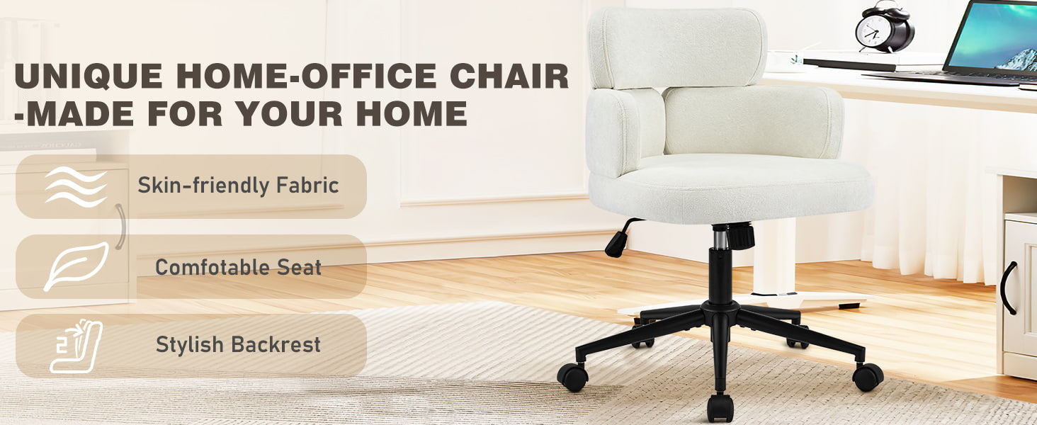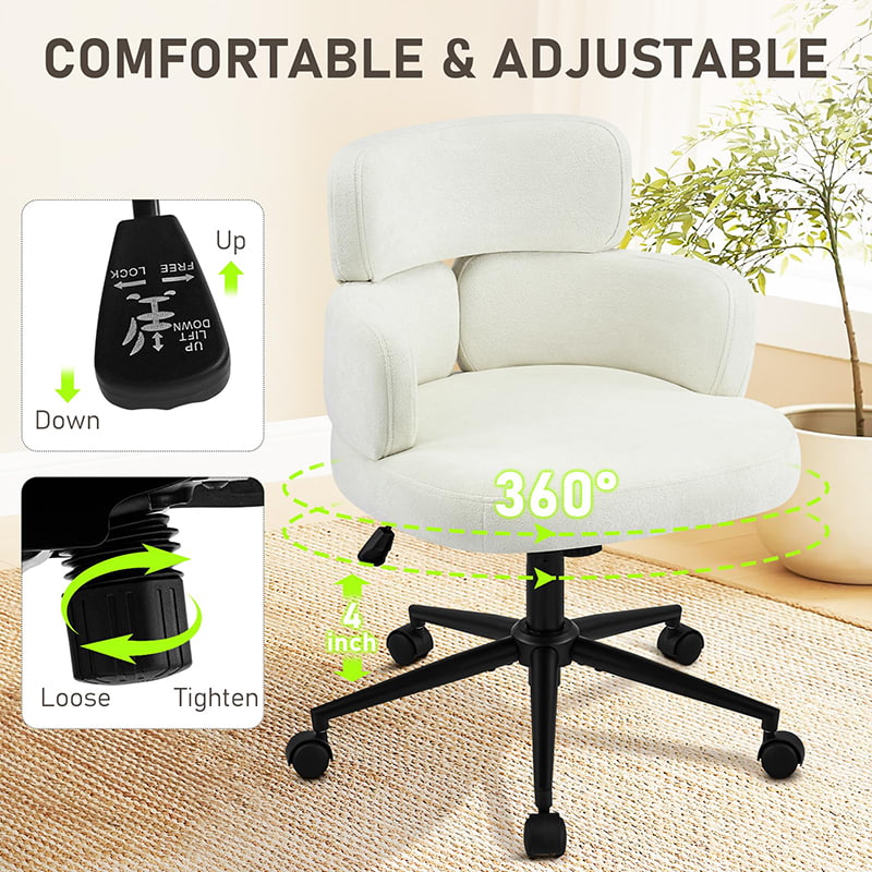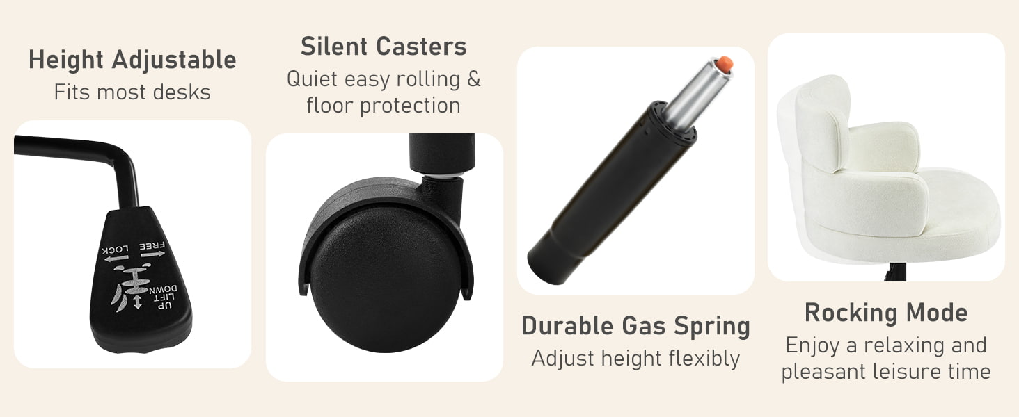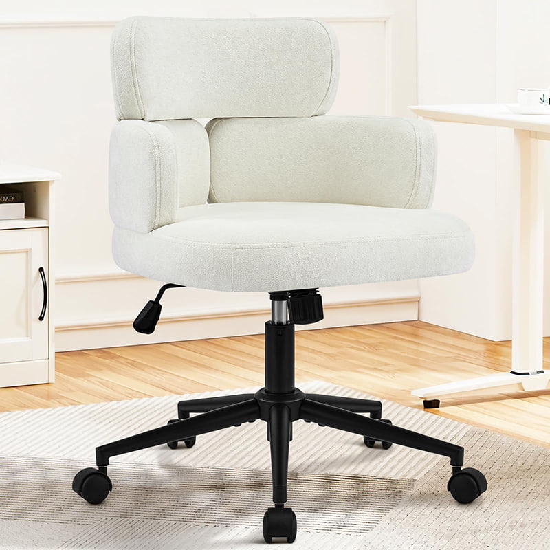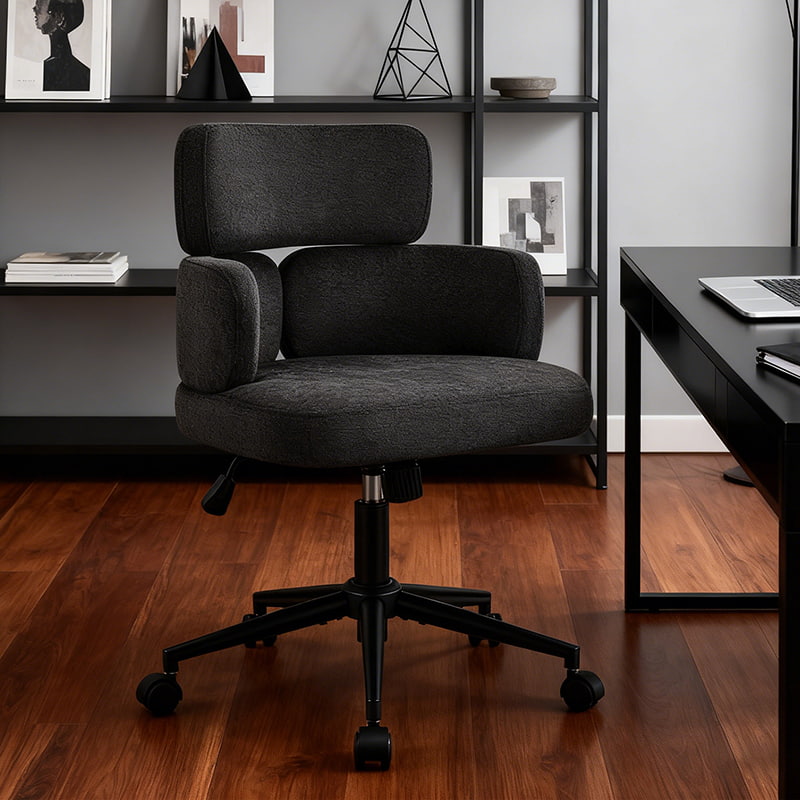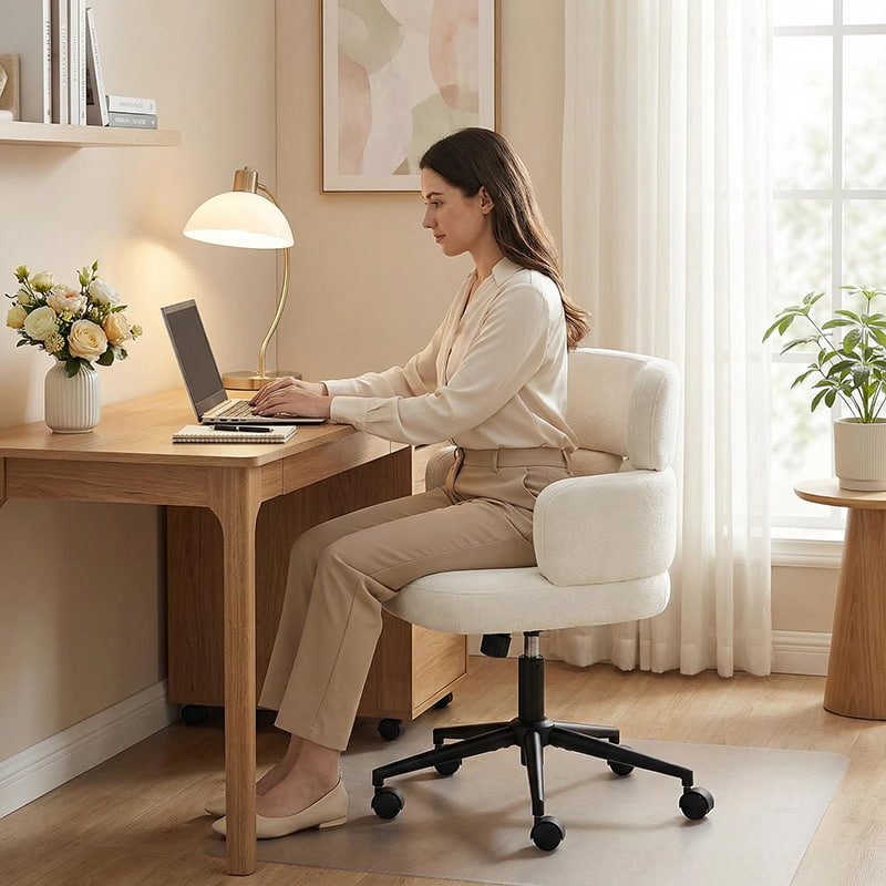 Denne polstrede, svingbare kontorstolen er designet for moderne hjemmekontorer, boutiquearbeidsområder og livsstilsfokusert interiør. Denne stolen har en karakteristisk kløverformet ryggstøtte med integrert armstøtte, og kombinerer visuell appell med funksjonell ergonomi. Det brede, mykt polstrede setet er trukket i hudvennlig chenillestoff, og tilbyr en myk og komfortabel sitteopplevelse for lange timer med arbeid, lesing eller avslapning. En justerbar høydemekanisme, jevn 360-graders svinging og skånsom gyngefunksjon lar brukere tilpasse sittestillingen sin med letthet, mens den solide metallbasen og de stille rullende hjulene sørger for stabilitet, mobilitet og gulvbeskyttelse i ulike miljøer.