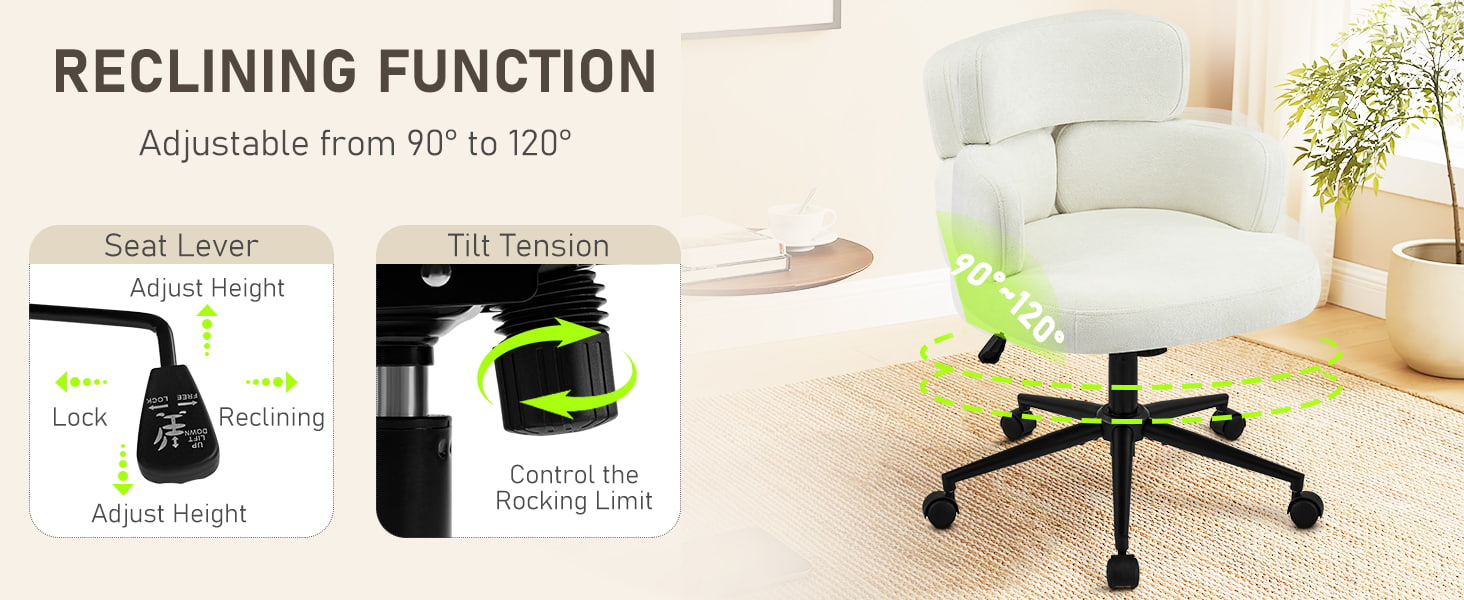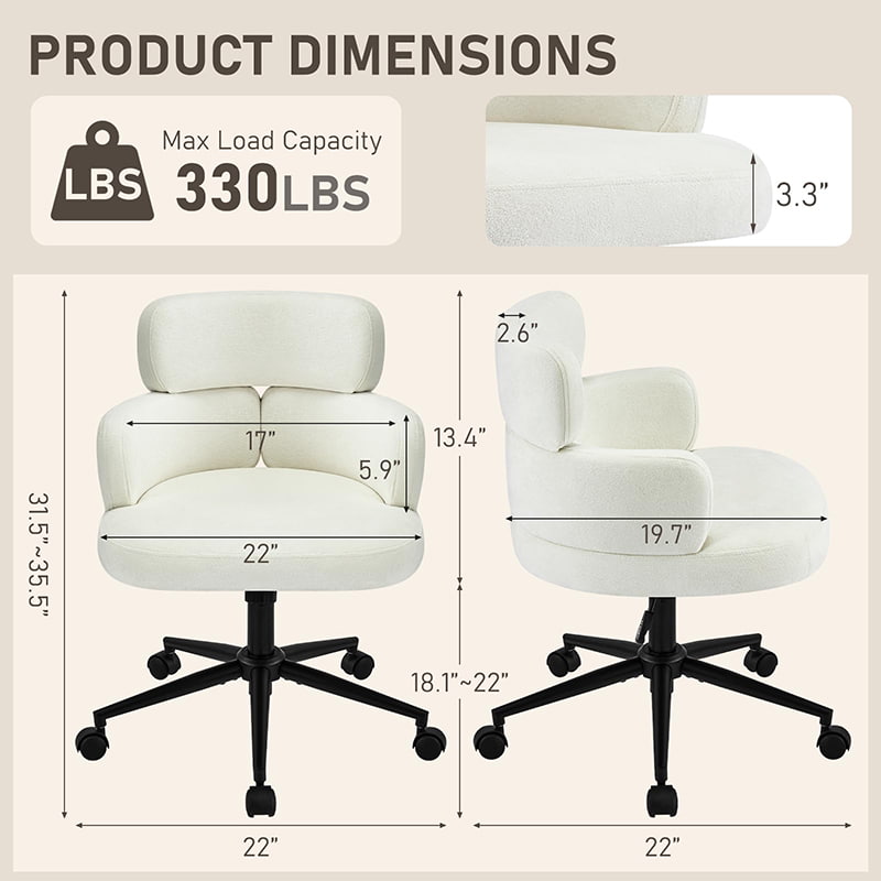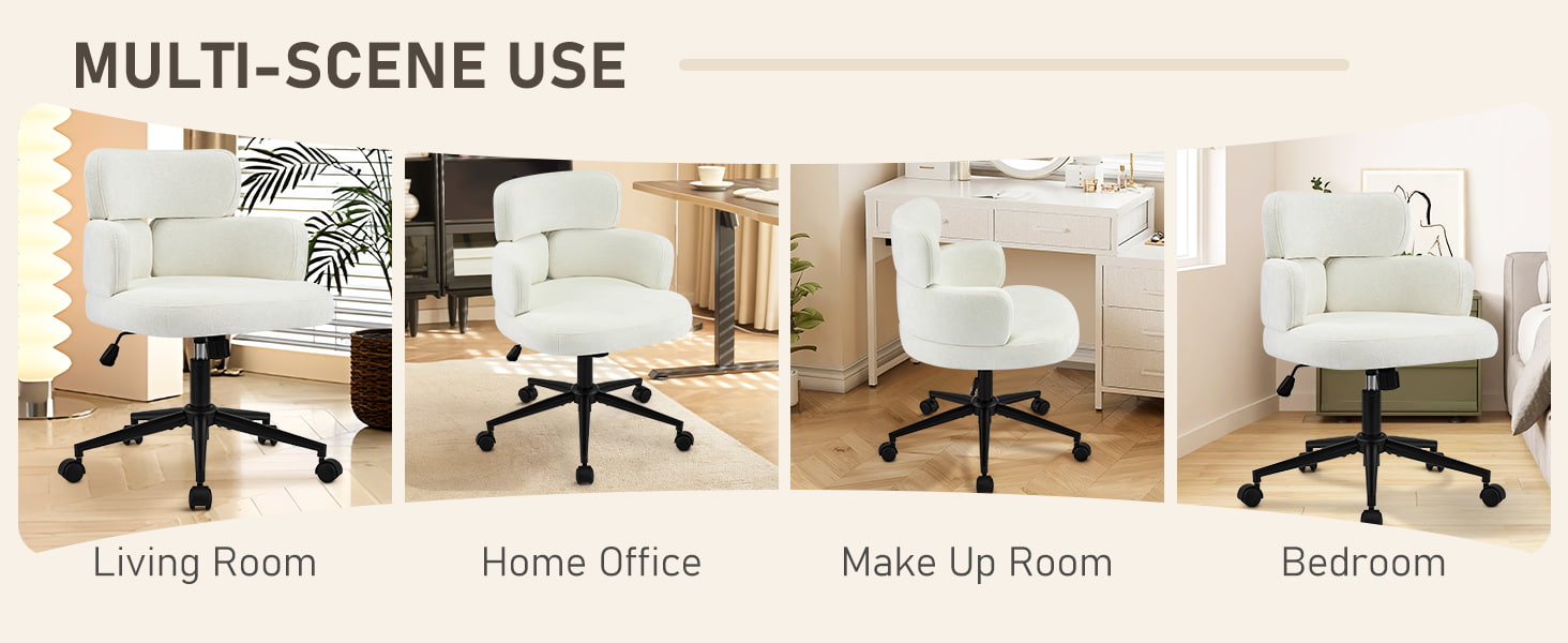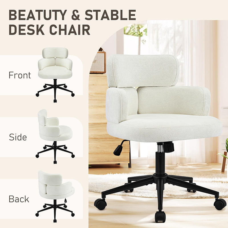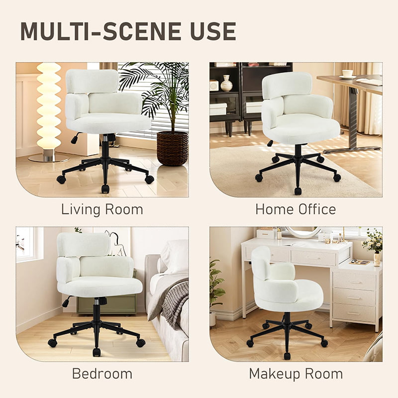 Denne polstrede, svingbare kontorstolen er designet for moderne hjemmekontorer, boutiquearbeidsområder og livsstilsfokusert interiør. Denne stolen har en karakteristisk kløverformet ryggstøtte med integrert armstøtte, og kombinerer visuell appell med funksjonell ergonomi. Det brede, mykt polstrede setet er trukket i hudvennlig chenillestoff, og tilbyr en myk og komfortabel sitteopplevelse for lange timer med arbeid, lesing eller avslapning. En justerbar høydemekanisme, jevn 360-graders svinging og skånsom gyngefunksjon lar brukere tilpasse sittestillingen sin med letthet, mens den solide metallbasen og de stille rullende hjulene sørger for stabilitet, mobilitet og gulvbeskyttelse i ulike miljøer.