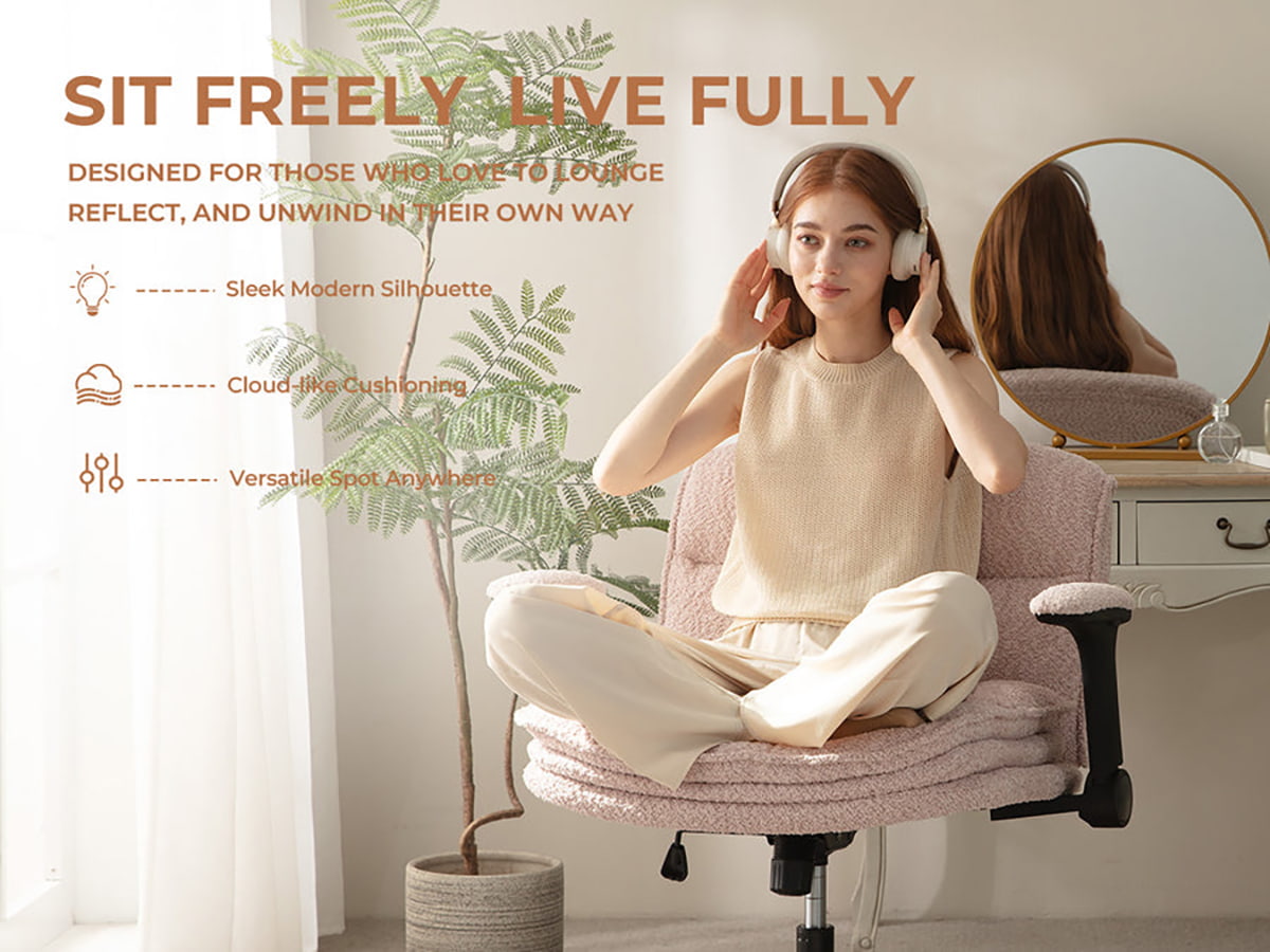 Flip-up armlener maksimerer fleksibiliteten – sitt med bena i kors, sidelengs, krøllet opp eller oppreist med letthet. Denne stolen er bygget for komfort, bevegelse og stil, perfekt egnet for hjemmekontorer, soverom og kreative rom.